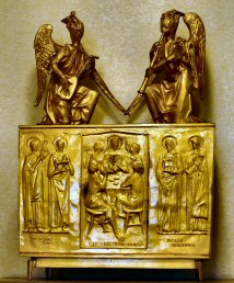 The Priest Approaches and Kisses the Altar: The altar is a symbol of Christ. In it are cut five crosses to recall the five wounds of Christ. The altar also represents the Church and has embedded in it the relics of her saints. The priest comes to the altar to celebrate the Sacrifice in the Church's name. Because of the glory surrounding the altar upon which the divine Sacrifice will be made, the kiss of the priest unites the Church to Christ, its Redeemer.