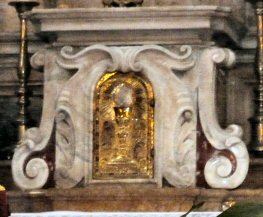 The Priest Approaches and Kisses the Altar: The altar is a symbol of Christ. In it are cut five crosses to recall the five wounds of Christ. The altar also represents the Church and has embedded in it the relics of her saints. The priest comes to the altar to celebrate the Sacrifice in the Church's name. Because of the glory surrounding the altar upon which the divine Sacrifice will be made, the kiss of the priest unites the Church to Christ, its Redeemer.