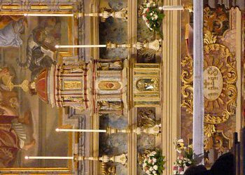 The Priest Approaches and Kisses the Altar: The altar is a symbol of Christ. In it are cut five crosses to recall the five wounds of Christ. The altar also represents the Church and has embedded in it the relics of her saints. The priest comes to the altar to celebrate the Sacrifice in the Church's name. Because of the glory surrounding the altar upon which the divine Sacrifice will be made, the kiss of the priest unites the Church to Christ, its Redeemer.
